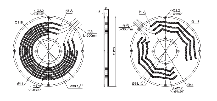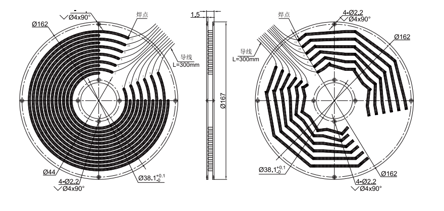 • · MPCB038C系列超薄盘式滑环,创新性使用PCB基材,最薄可达8mm,采用超硬镀金处理,超厚铜箔工艺,最大电流可达10A, 定子线和转子线对应使用彩色导线,简化了安装和连接。