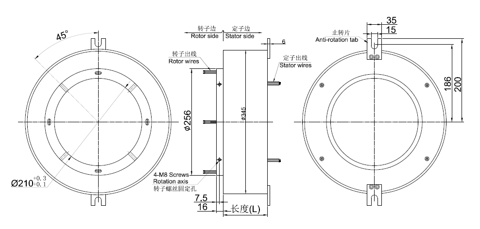 • · 通孔直径为210mm(适用于<=210mm)的标准系列整体式精密导电滑环。*注意:如需<210mm的内孔,可顺利获得加内衬轴套解决。